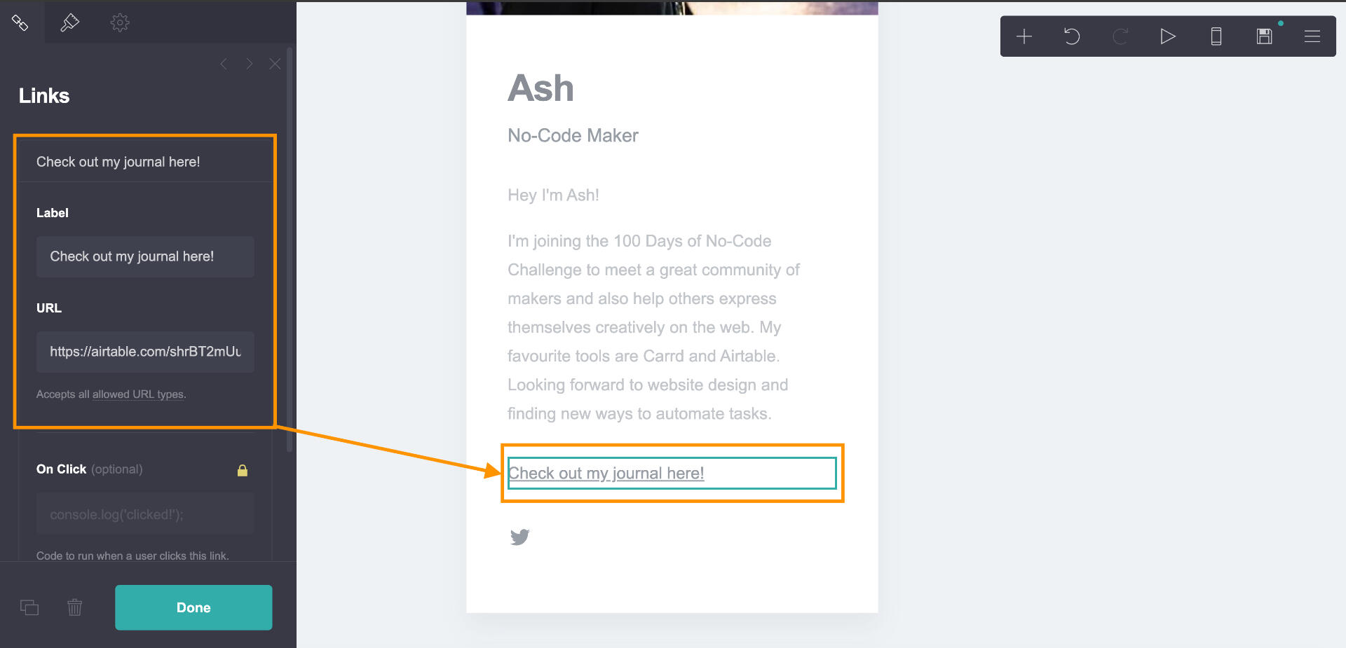 Alright, are you ready for some magic?Here's where we take things to the next level and start integrating different digital tools โจLet's link our Airtable journal we made in Part 1 to our website so we can showcase our progress. We'll add it just under our bio and can do this in three ways: