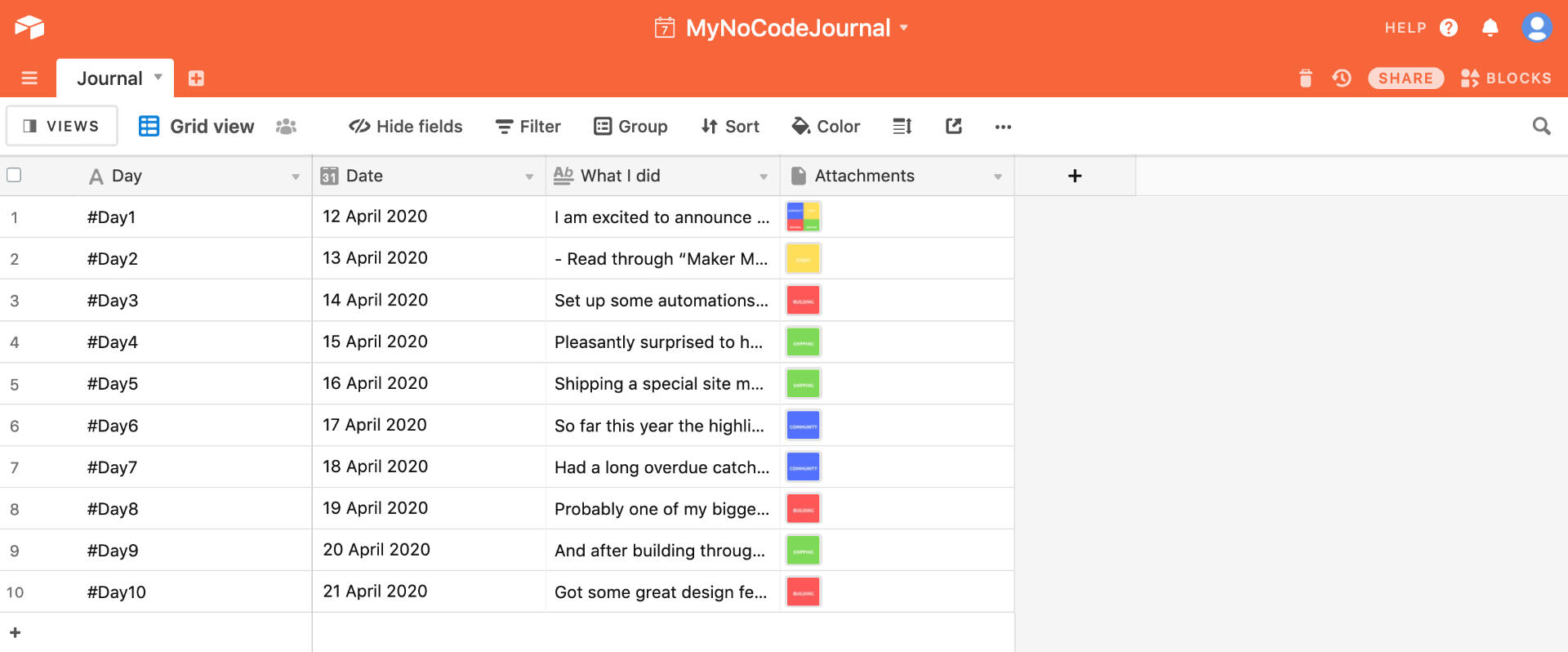 Here's a sample of a daily journal you can make for free with no-code! I've tracked my progress in the 100 Days of No Code challenge learning and building across four categories: study (reading articles, books and tutorials), community (interacting and meeting up with members of the challenge), building (applying the knowledge to create new features) and shipping (launching something new, ready to share!).