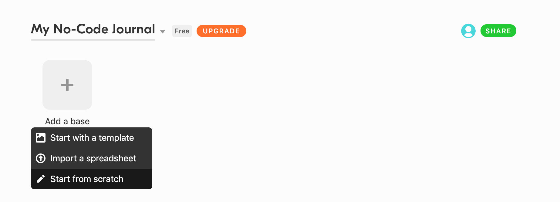 When you first come to the homepage Airtable will suggest a few templates to get started. Feel free to browse these in a bit but I'll show you how to customise your own.Instead hop down and create your own base. This is the same of creating a new Excel file or workbook but with a few extra features ๐