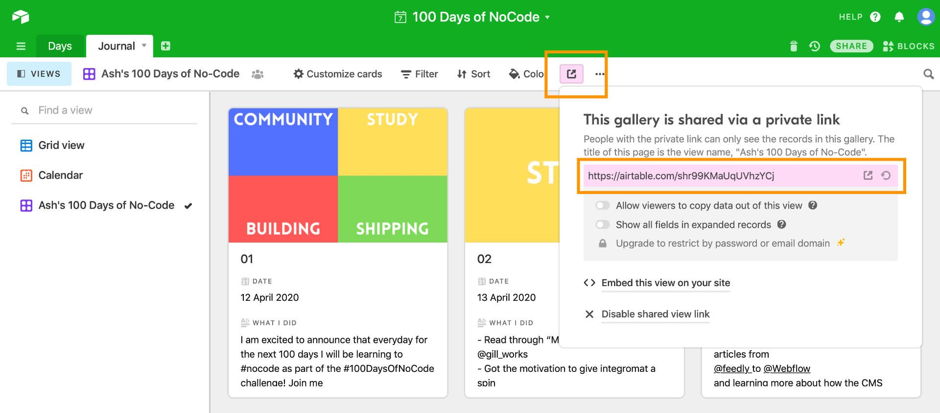 Finally let's set up a link where you can share your journal.Airtable gives you a couple options which we'll explore in Part 2.For now, navigate to the export button (not the 'share' button - I mix these up all the time too). Copy the link and paste in your browser. This is how your journal will look when you share it.