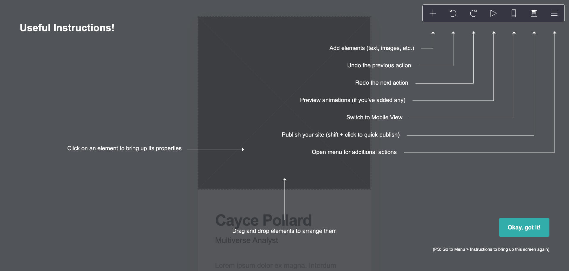 Carrd has a minimal editor providing you with drag and drop building blocks you can customise without any code!If you ever want an overview of the builder space, click on the menu icon and select 'Instructions'. You'll see an overlay like the image below.If you ever need some more tips on creating elements or using Carrd then you can click on the menu icon and selecting 'Documentation'.