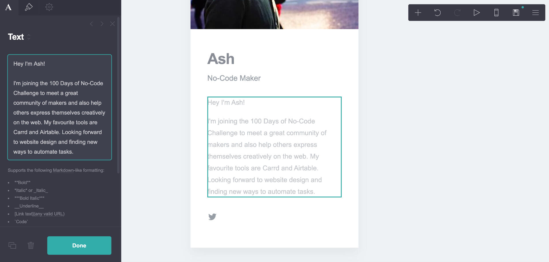 I'm joining the 100 Days of No-Code Challenge to meet a great community of makers and also help others express themselves creatively on the web. My favourite tools are Carrd and Airtable. I'm looking forward to learning more about website design and finding new ways to automate tasks.