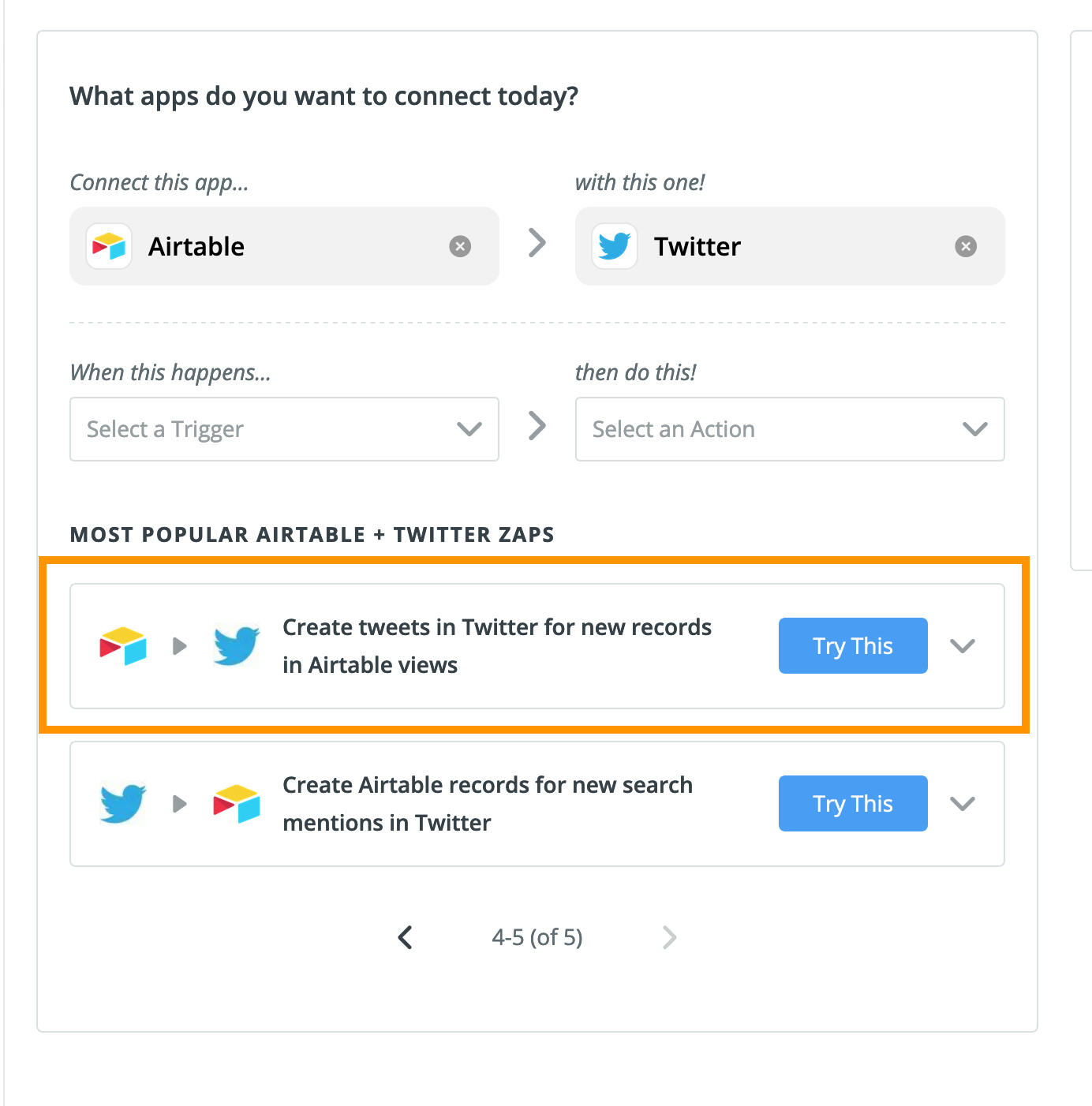 For this feature we're building into our journal we'll be sending an automatic tweet every time we write a new entry in our Airtable journal.In the first search box enter 'Airtable' and in the second box enter 'Twitter'.