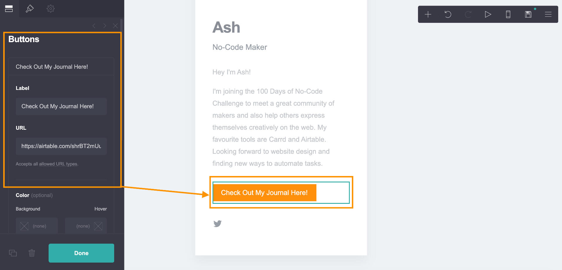 You'll create a new element that will default with the text 'Link'.Open up the side bar editor to rename your link and add your Airtable journal URL you want your visitors to see.
