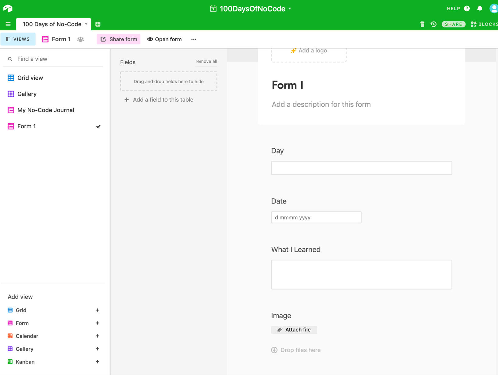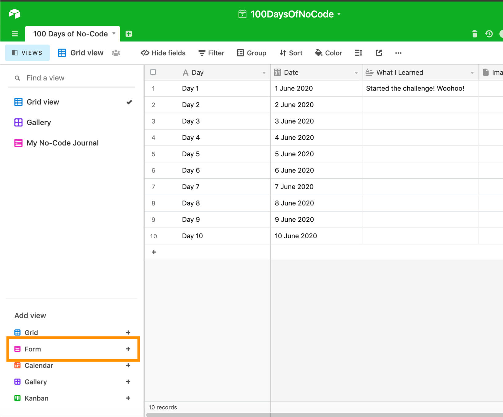 An Airtable spreadsheet to record your progress through the #100DaysOfNoCode challenge. We'll also learn how to use the different views to share later.๐ **What you'll need: **