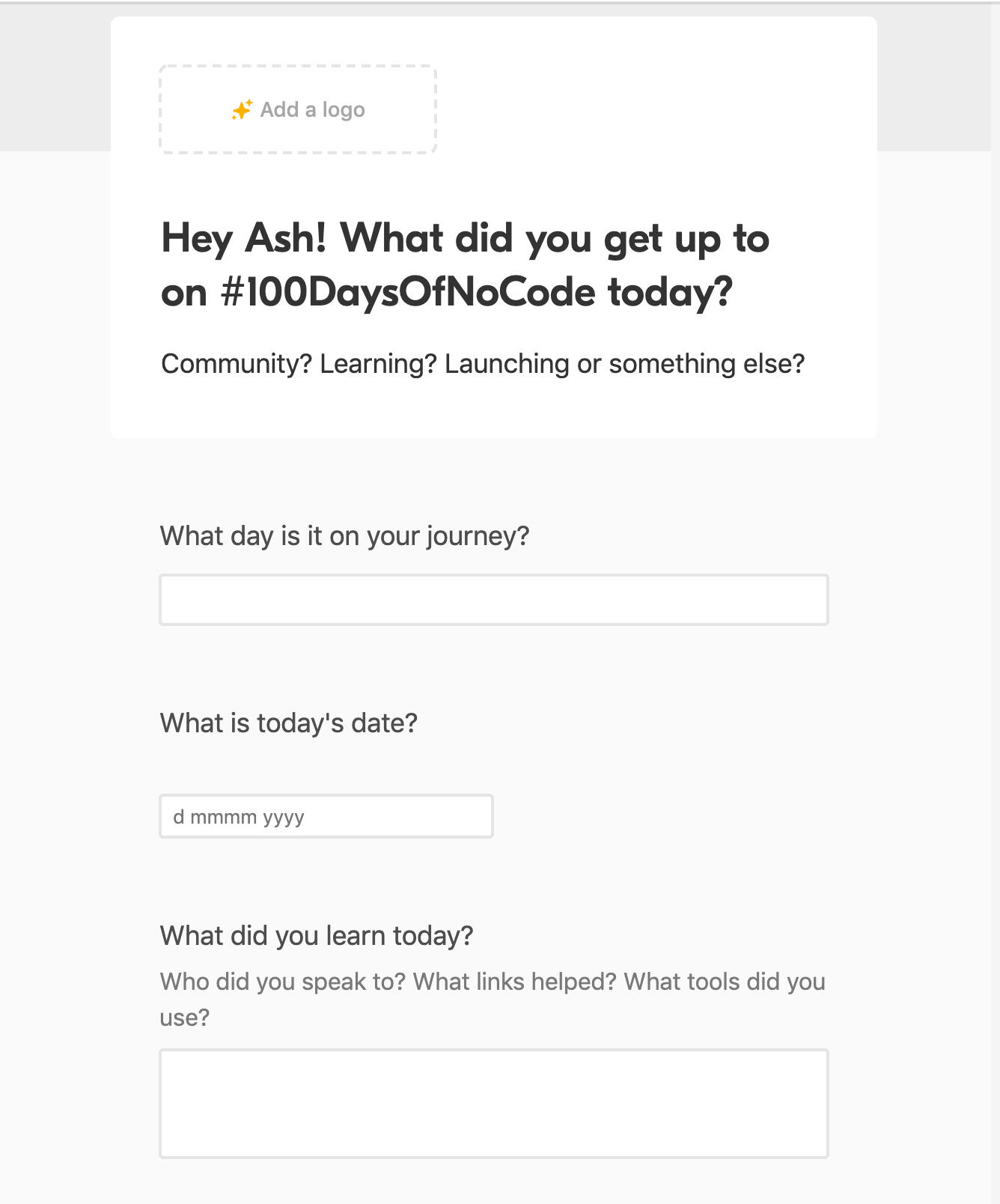The form view automatically defaults to the names of your spreadsheet columns but this is where you can get creative! Essentially each field links back to your form as a new entry, but you can change the prompt to whatever style suits you.Want to stick with a simple title field? Fine.Or you can ask yourself questions. This might spark some ideas for new fields you never thought of before and that's totally cool! No-code is all about learning and iterating on ideas. Here's one of mine as an example: