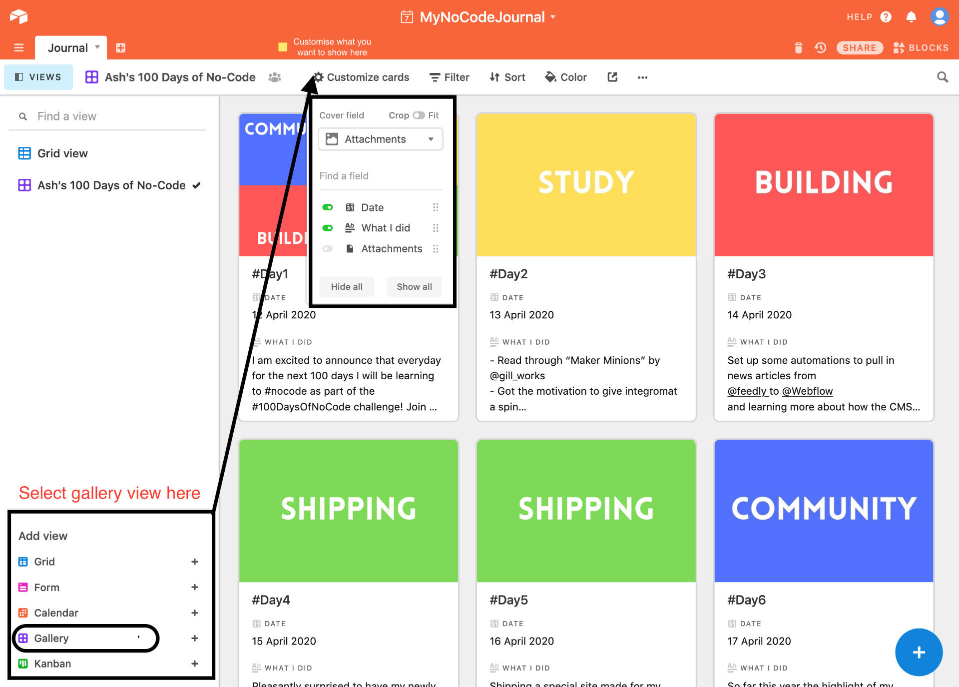 Here's another great feature of Airtable - using different views.One of my favourite is the gallery view which transforms your spreadsheet into a window of tiles to browse through.With a few customised settings you can toggle a cover image so people can easily see what your highlight of the day was.For the 100 Days of No Code Challenge I've added an image showing the category for the day. This can be anything you want - a daily dish, illustration or high score - up to you!