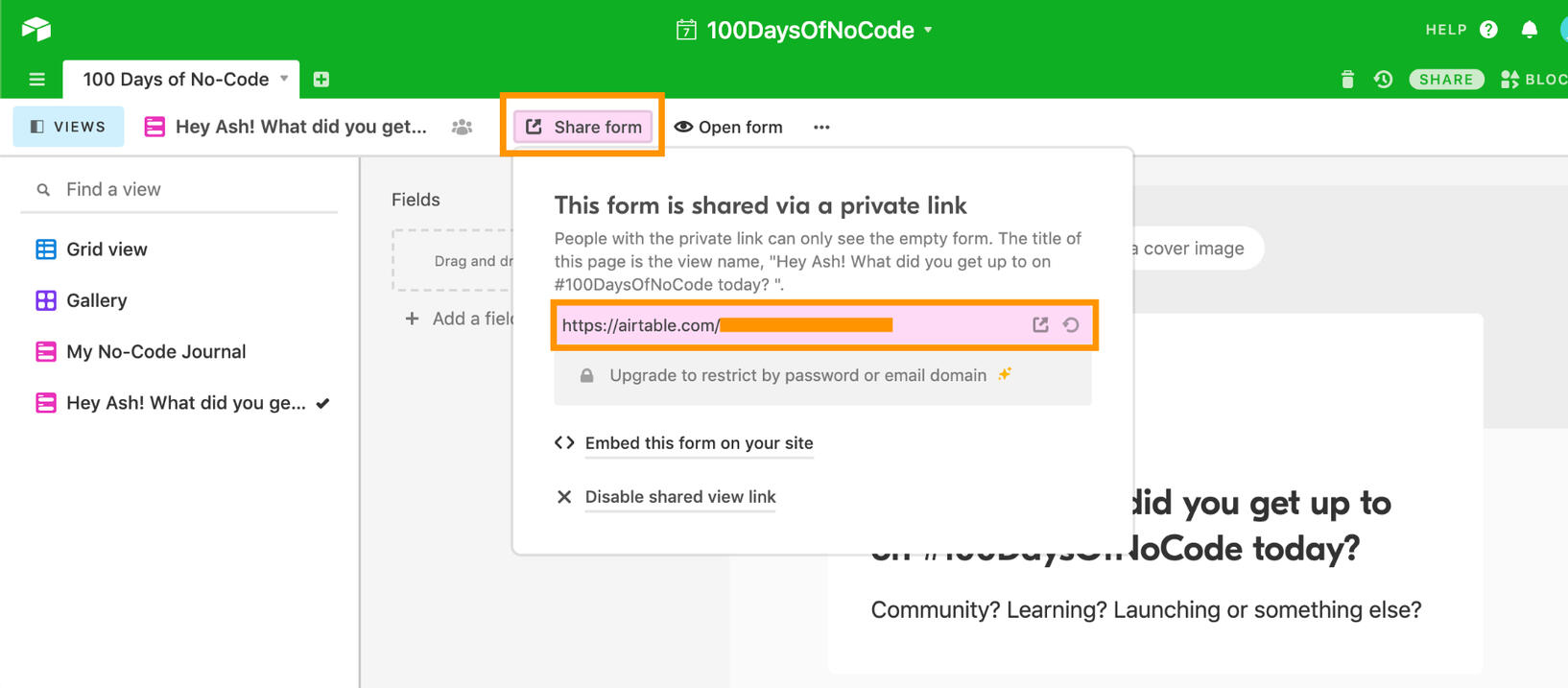 This part of the tutorial is to make it easy to log your progress each day without having to log into your Airtable account multiple times.Instead we'll create a link you can access anywhere to upload your progress as you go.