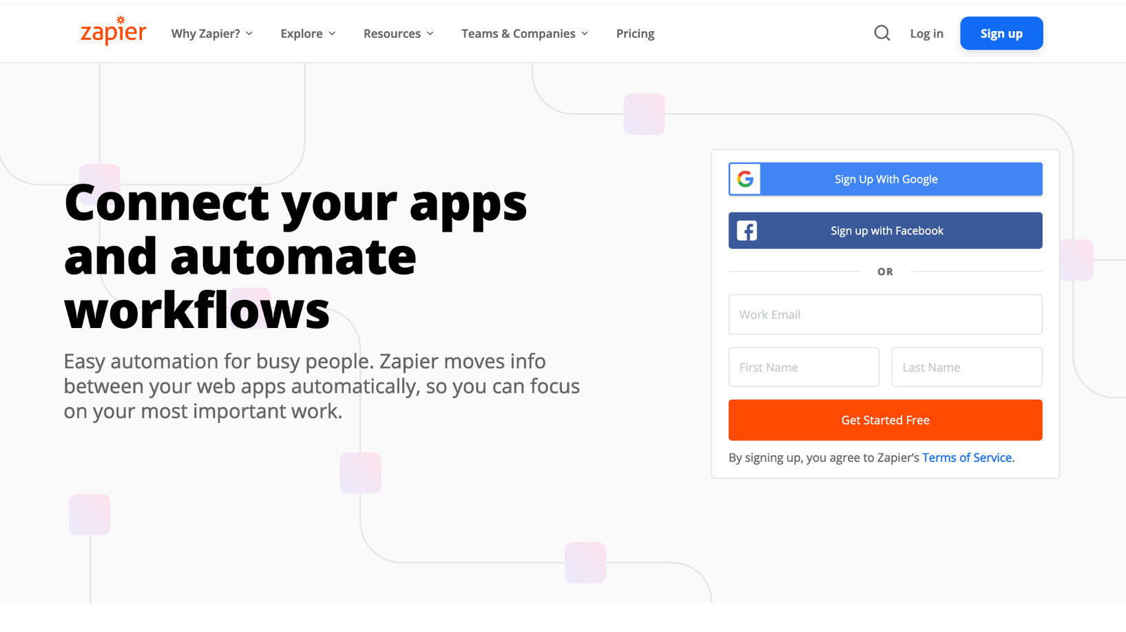 Zapier has been around since 2012 and has been one of the original teams building no-code integrations. They have one of the highest number of integrations and offer a pretty easy free plan to get started.Let's head on over to Zapier.com to get our new automation set up.