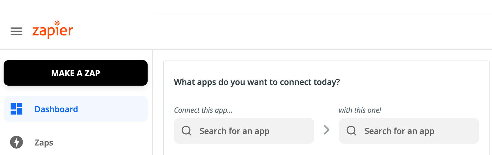 An automation here is called a zap.When you log into the dashboard you can make a zap in two ways - via the side menu, or by the quick start area in the middle of the screen.Because it's right there, let's start with the "What do you want to connect today?" section on the right hand side below.